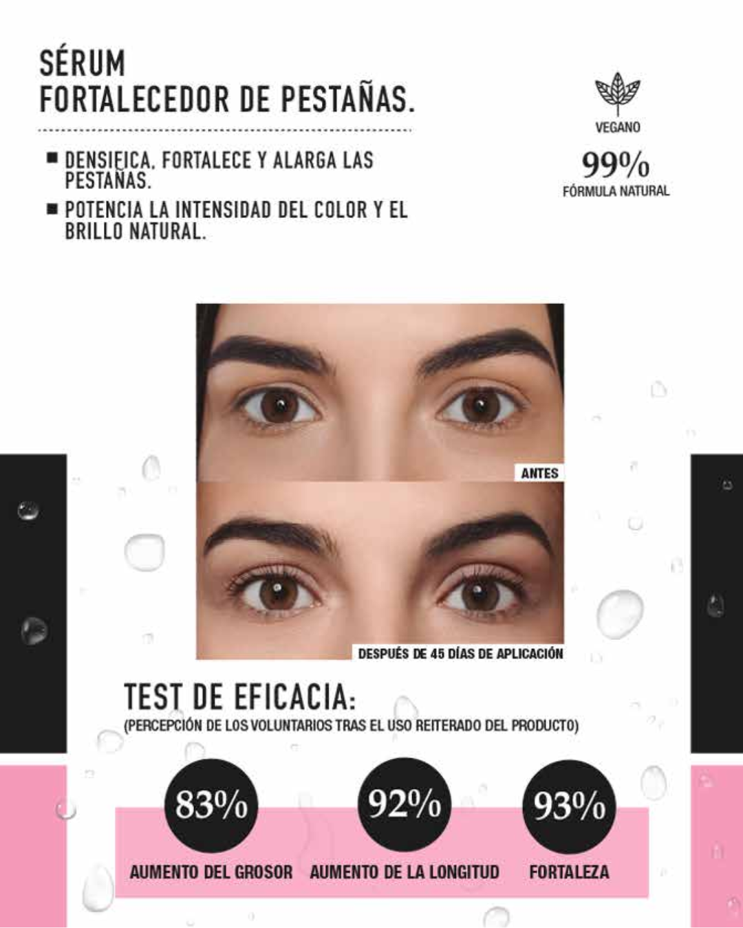 Con aplicación diaria, observa cómo tus pestañas se transforman, volviéndosemás voluminosas, largas y radiantes. Además, es seguro para piel y ojos sensibles.